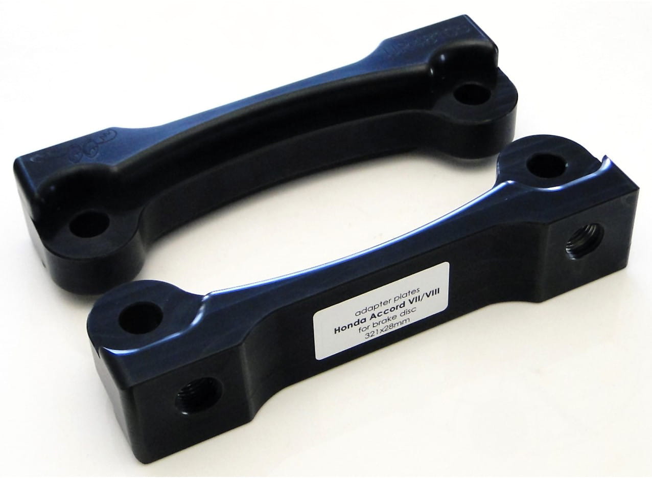 Brake caliper adapters are made of aluminum magnesium, which is widely used in motorsports. It is characterized by high mechanical strength, comparable to steel, and a low dead weight, 70% less than steel.