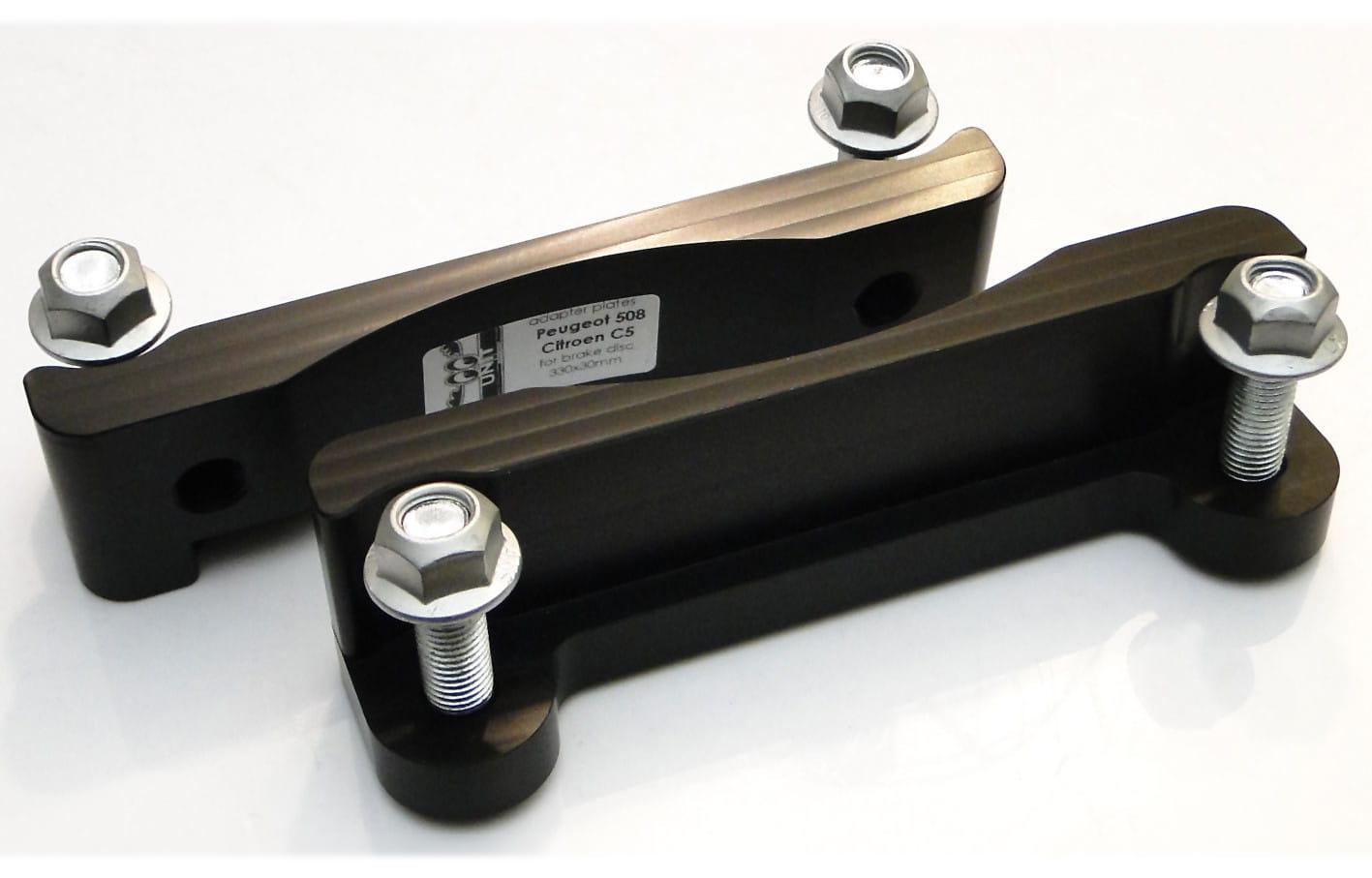 Adapters allow the installation of 4 piston [Alfa Romeo 159 / Brera] BIG BREMBO or 4 piston [Megane 3RS / 4RS] BIG BREMBO caliper on a brake disk 330 x 30 mm [OE Peugeot]