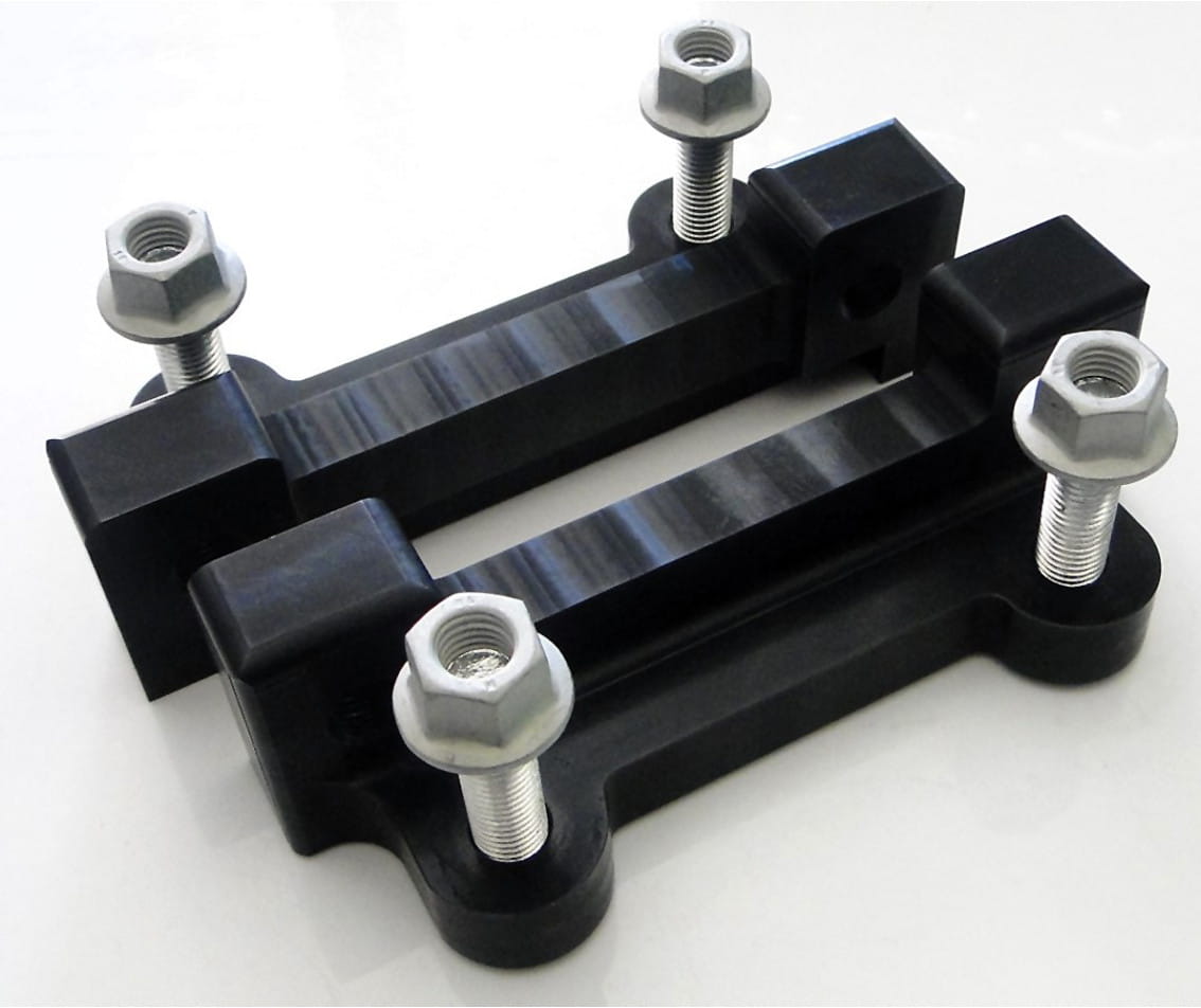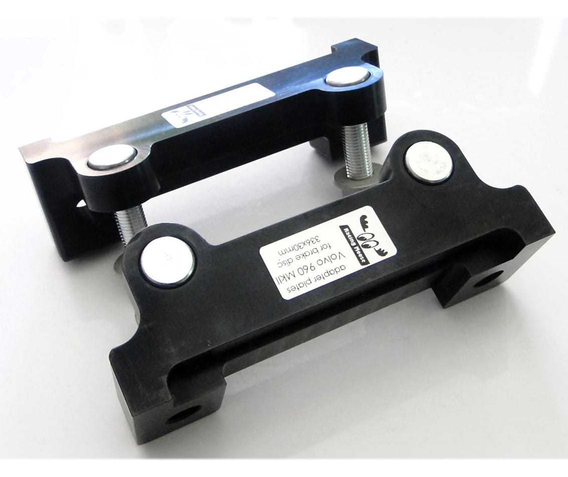 Brake caliper adapters are made of aluminum magnesium, which is widely used in motorsports. It is characterized by high mechanical strength, comparable to steel, and a low dead weight, 70% less than steel.